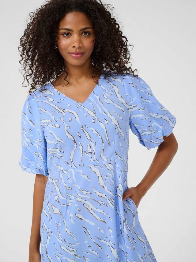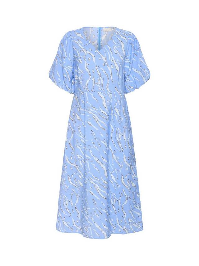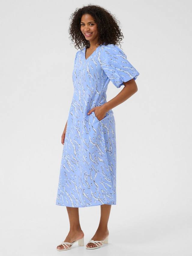 Платье миди Hannah — это элегантный и универсальный фасон с красивым принтом. V-образный вырез, потайная молния сзади и приталенный крой с расклешенной юбкой. Рукава — полукруглые, с эластичными краями, длина до середины голени.