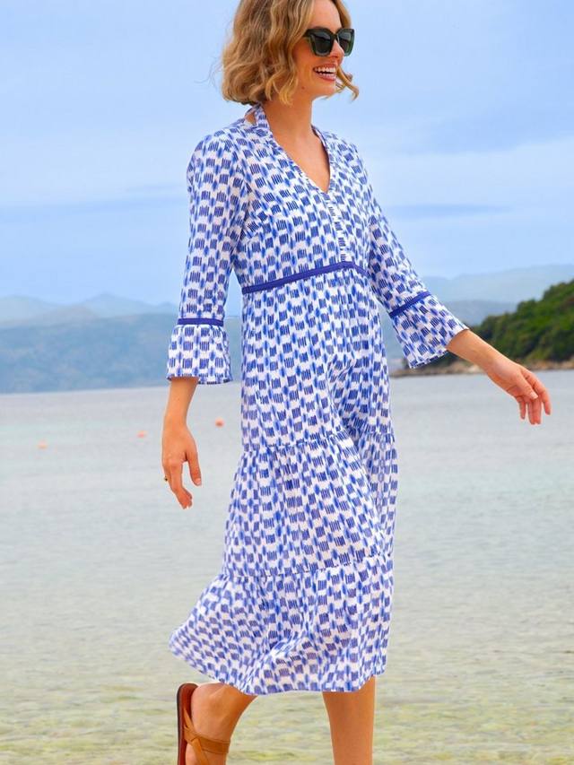 Это платье миди из чистого хлопка обеспечит вам комфорт и готовность к любым ситуациям. Многоярусный крой не сковывает движений, а расклешенные рукава и V-образный вырез добавят интригующего штриха в ваш повседневный образ.