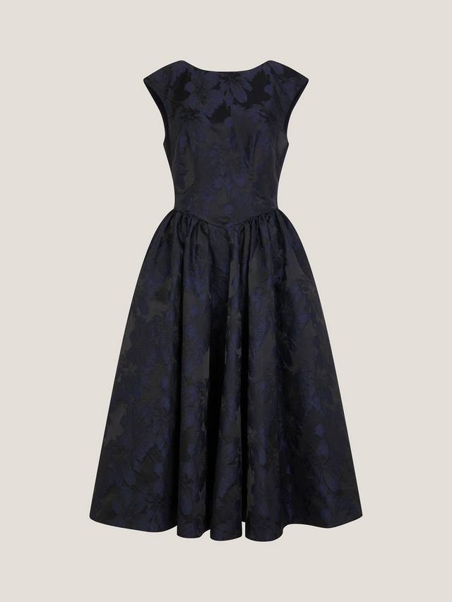 Доказательство того, что облегающий крой с расклешенной юбкой — классика не просто так. Это платье миди без рукавов от Monsoon с V-образным вырезом сзади и мерцающим жаккардовым цветочным принтом.