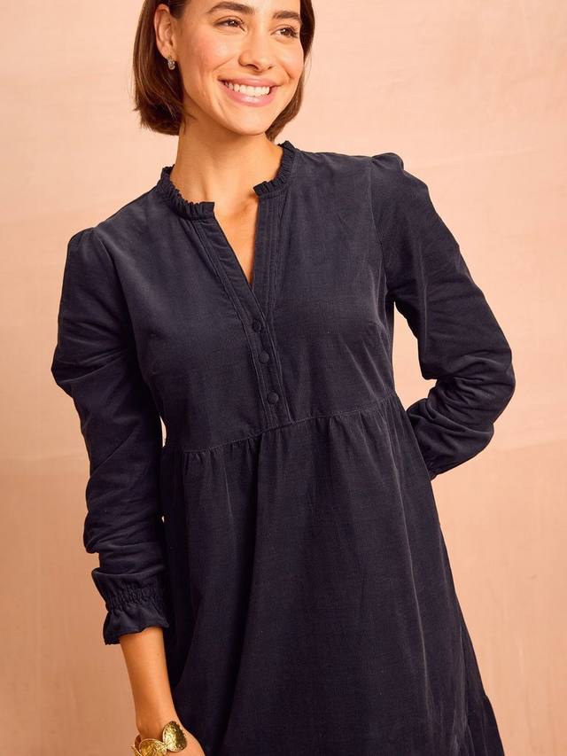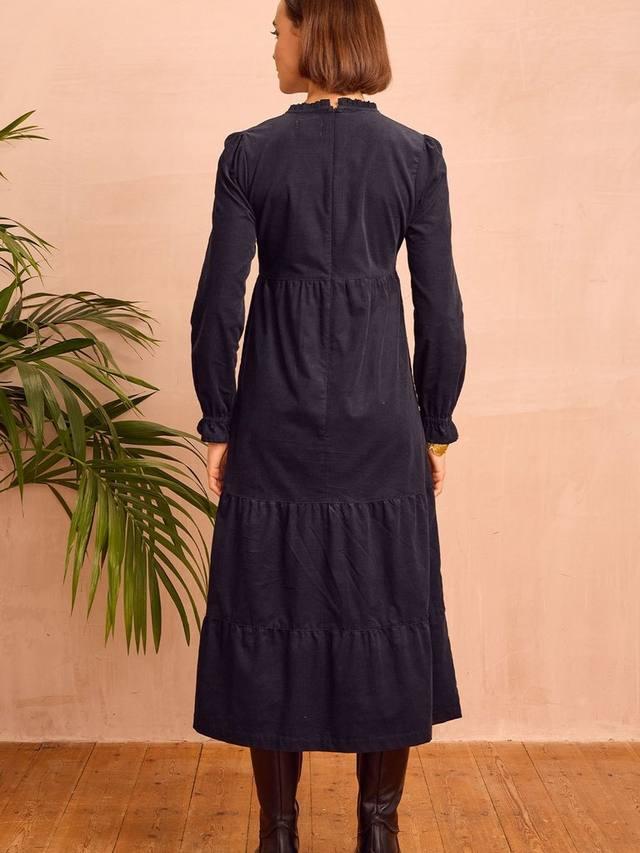 Это платье миди из мягкого вельвета из органического хлопка обеспечит вам комфорт в течение всего дня. Многоуровневый крой и V-образный вырез создают непринужденный образ, а длинные рукава обеспечивают идеальную защиту для любых планов. Выбирайте нарядный или повседневный образ в зависимости от настроения.