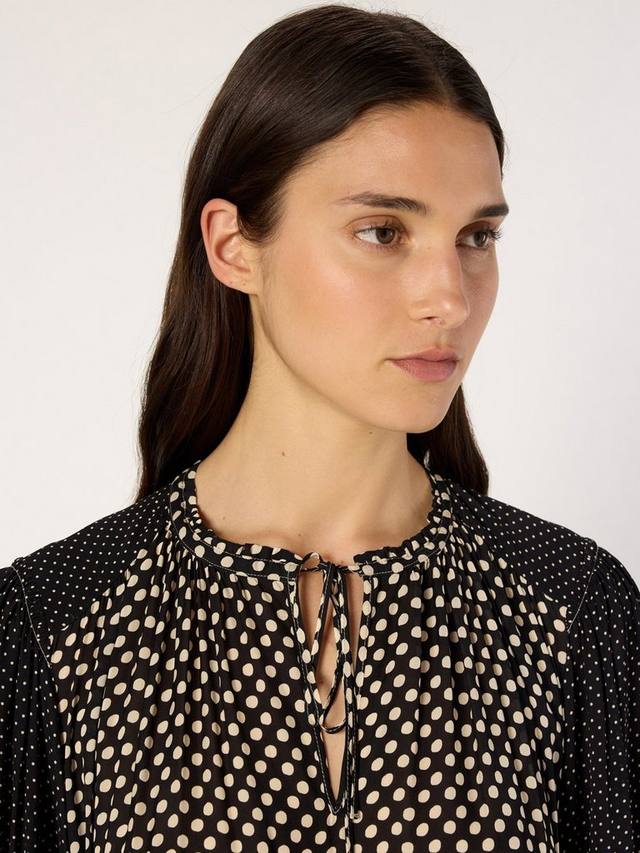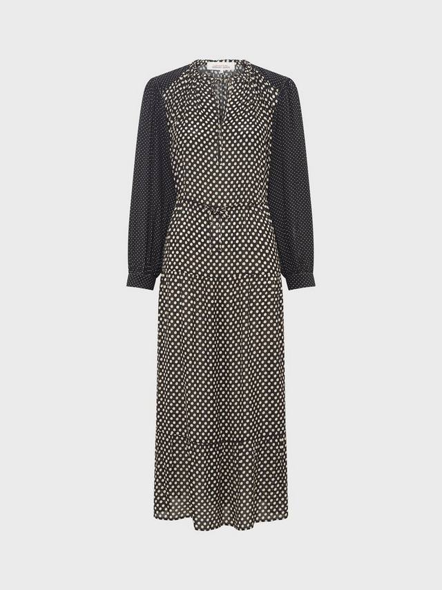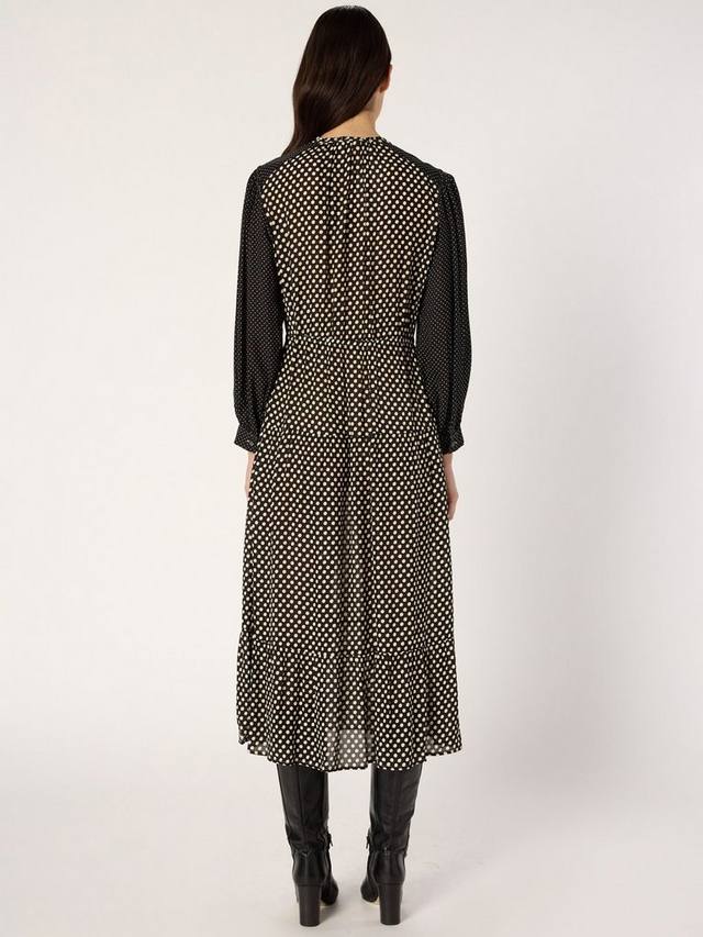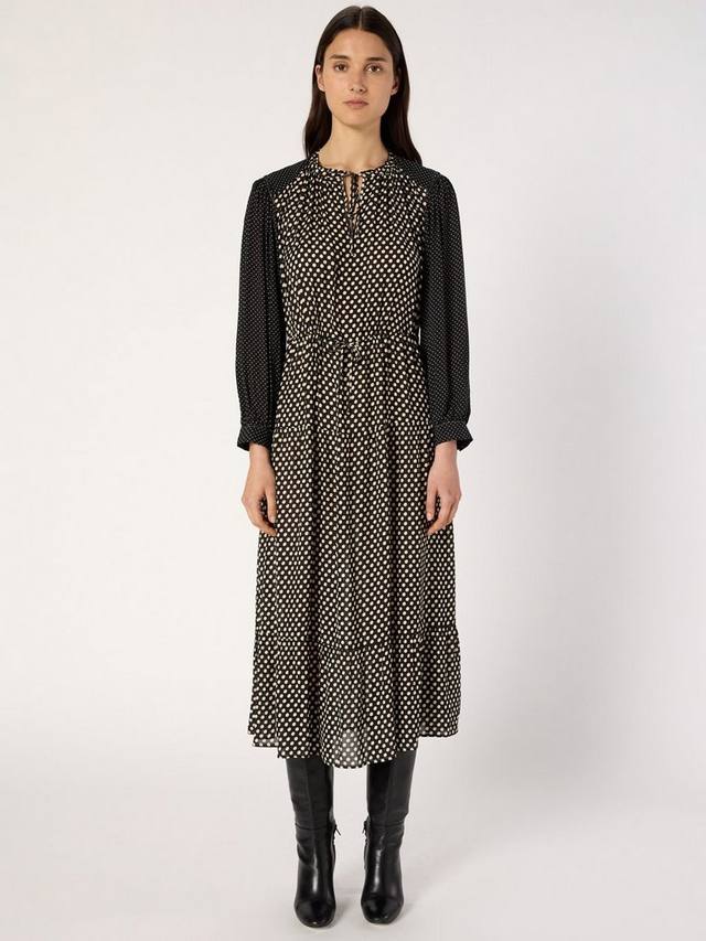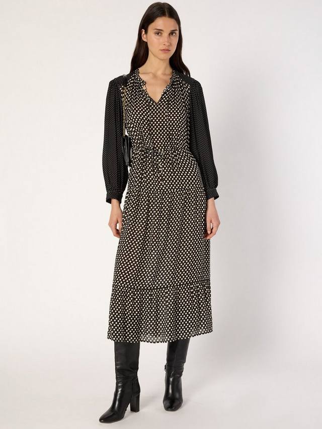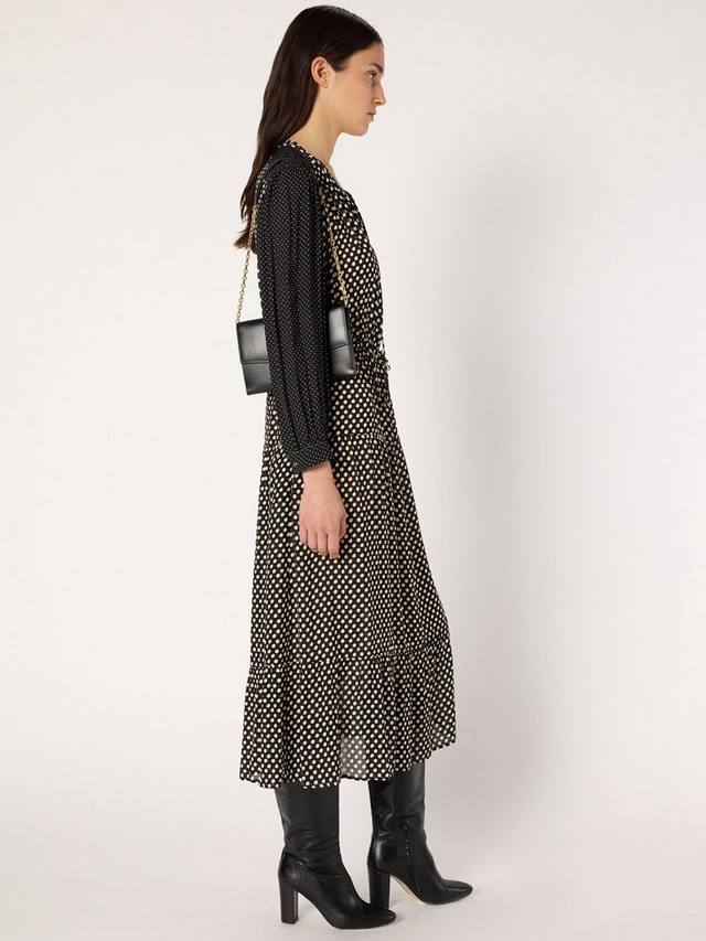 Это многоярусное платье миди с завязкой на шее и игривым узором в горошек добавит очарования вашему дню.