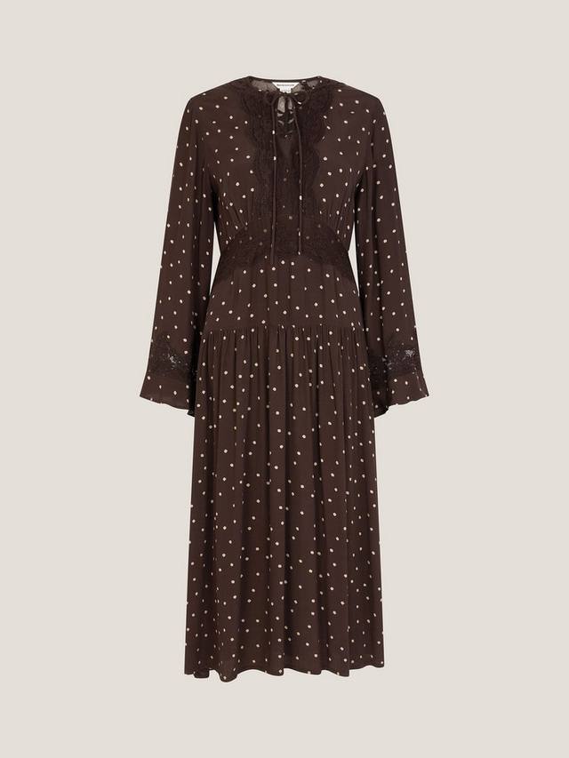 Потрясающее многоярусное плетение. Это платье миди с длинными рукавами от Monsoon дополнено V-образным вырезом, а узор в горошек придаёт ему ретро-стиль.