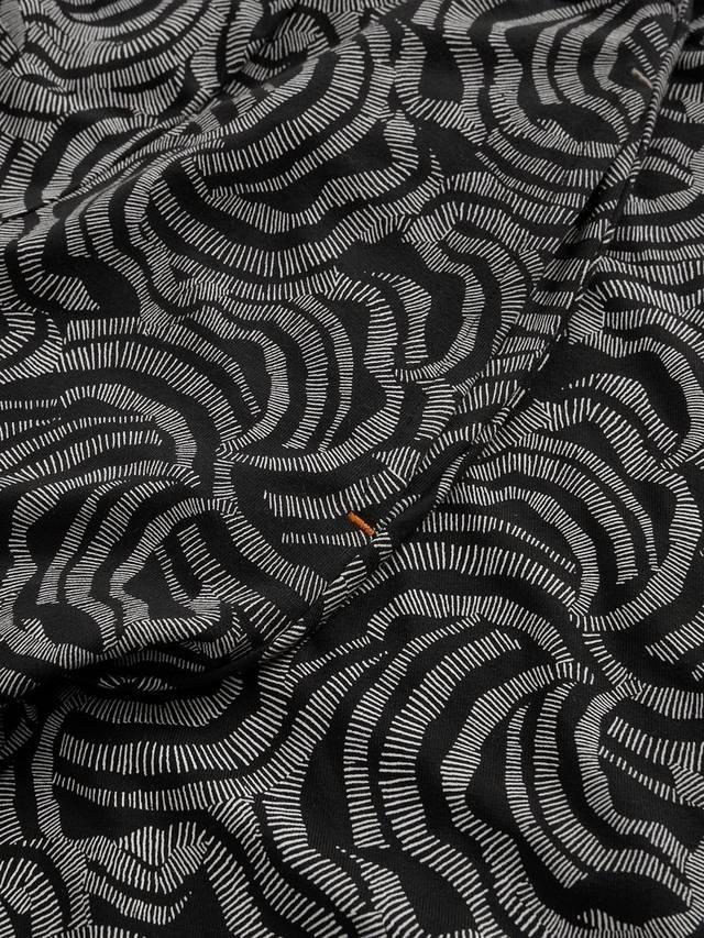 Это платье миди от White Stuff, удобное в носке благодаря А-силуэту и расклешенному подолу, выполнено из смесовой вискозы с трикотажем. Платье имеет простой, но элегантный V-образный вырез и рукава до локтя, а также украшено абстрактным принтом в виде завитков.