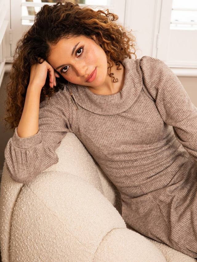 Уютное и непринужденное платье Meredith Turtle Neck Dress в цвете Sparkle Chocolate. Платье выполнено из мягкого трикотажного полотна в рубчик с тонким металлическим отливом и сочетает в себе комфорт и сдержанный гламур. Свободный вырез, потайные боковые карманы, мягко прилегающий лиф и расклешенная юбка миди делают Meredith привлекательным и удобным в носке. Рукава три четверти с мягким объёмом придают современный и женственный вид, делая его идеальным как для повседневного, так и для вечернего гардероба. Носите с ботильонами днем или дополните каблуками и серьгами для создания изысканного трикотажного образа.