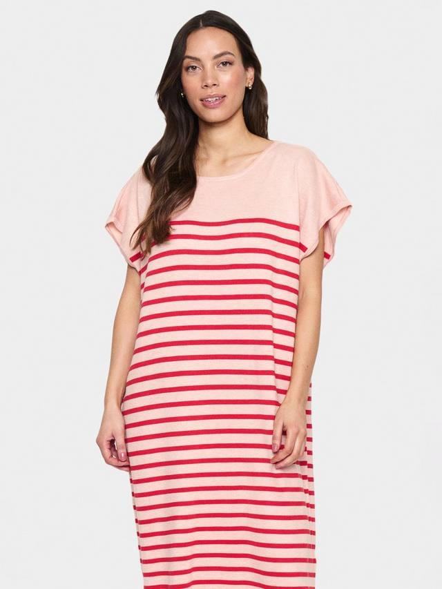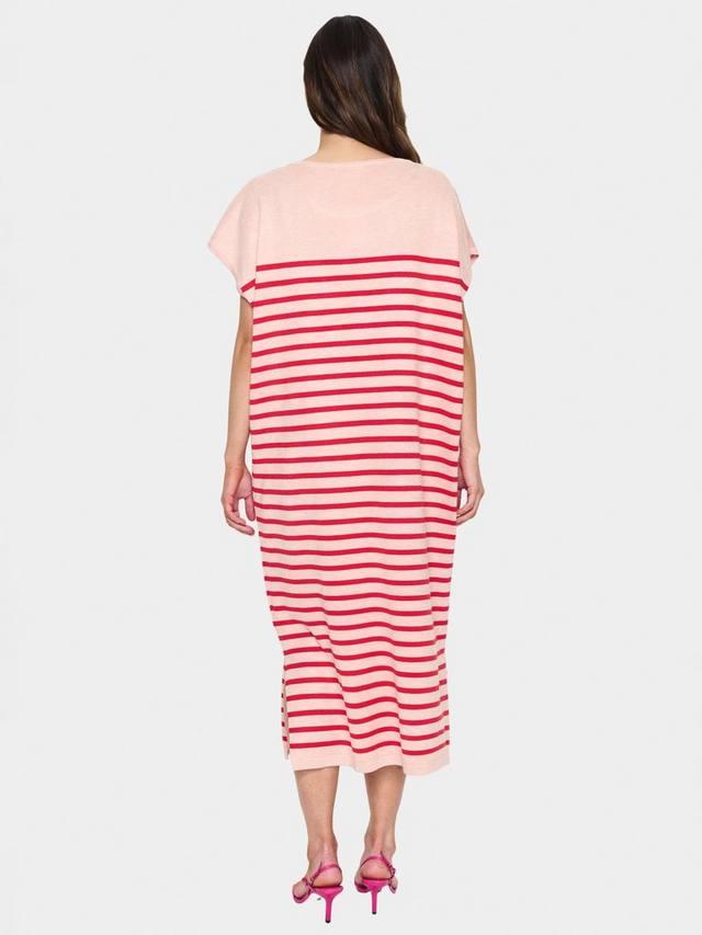 Это прямое платье миди из Сен-Тропе, отличающееся простотой и лаконичностью, сшито из лёгкой вискозной ткани. Круглый вырез, короткие рукава и контрастные полоски – всё это дополнено.