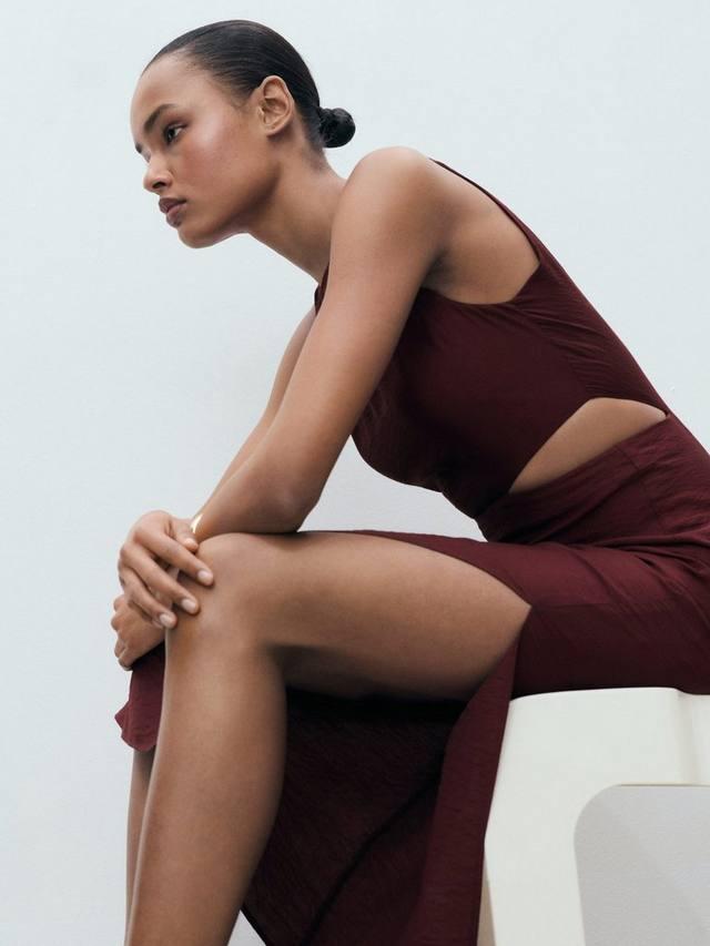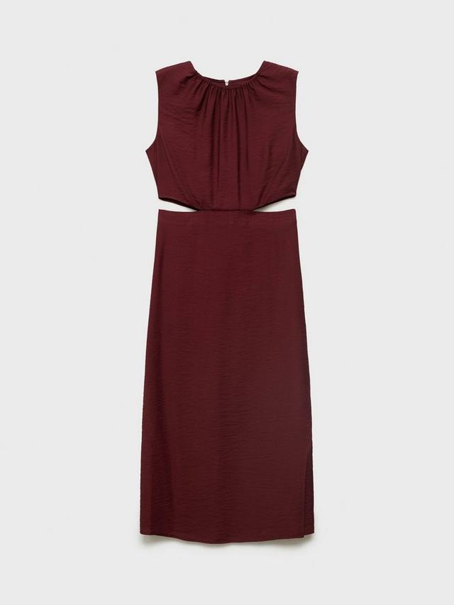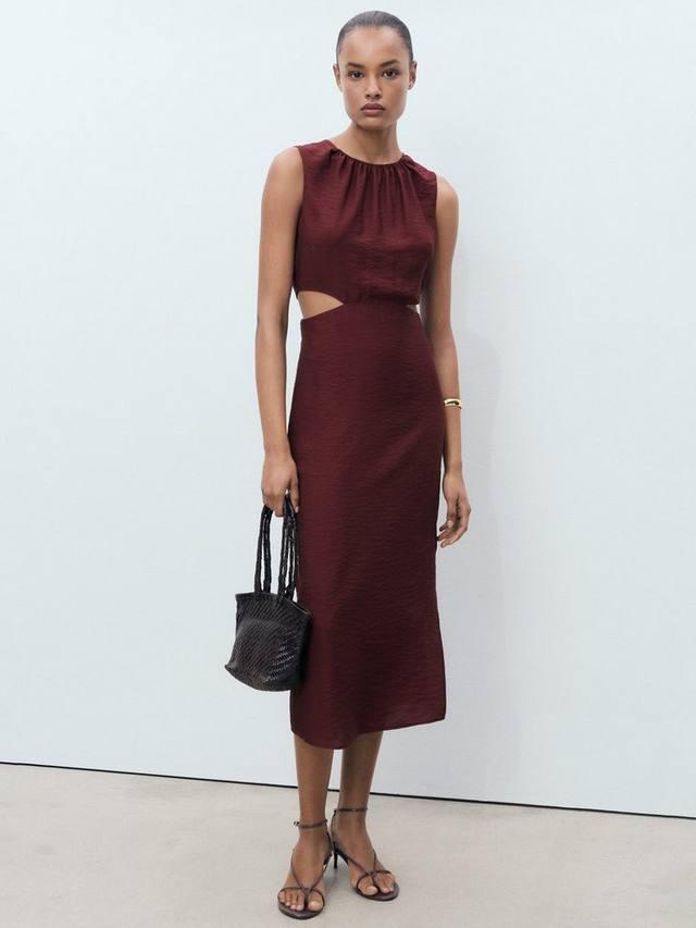 Это прямое платье миди от Mango с круглым вырезом на сборке и вырезами на талии выполнено из легкой вискозной смеси.
