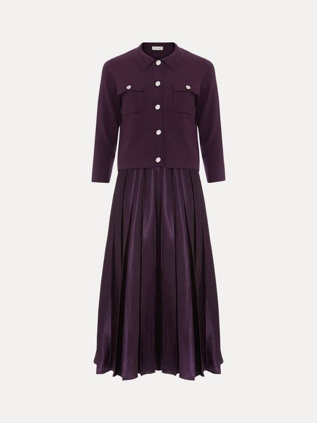 Два образа в одном? Запишитесь к нам! Это атласное платье миди создано для создания непринужденных многослойных образов. Оно состоит из пышной плиссированной юбки и элегантного лифа без рукавов, которые можно носить отдельно для создания сдержанного образа или накинуть на платье вязаный кардиган с металлическими пуговицами в качестве стильного дополнительного слоя.