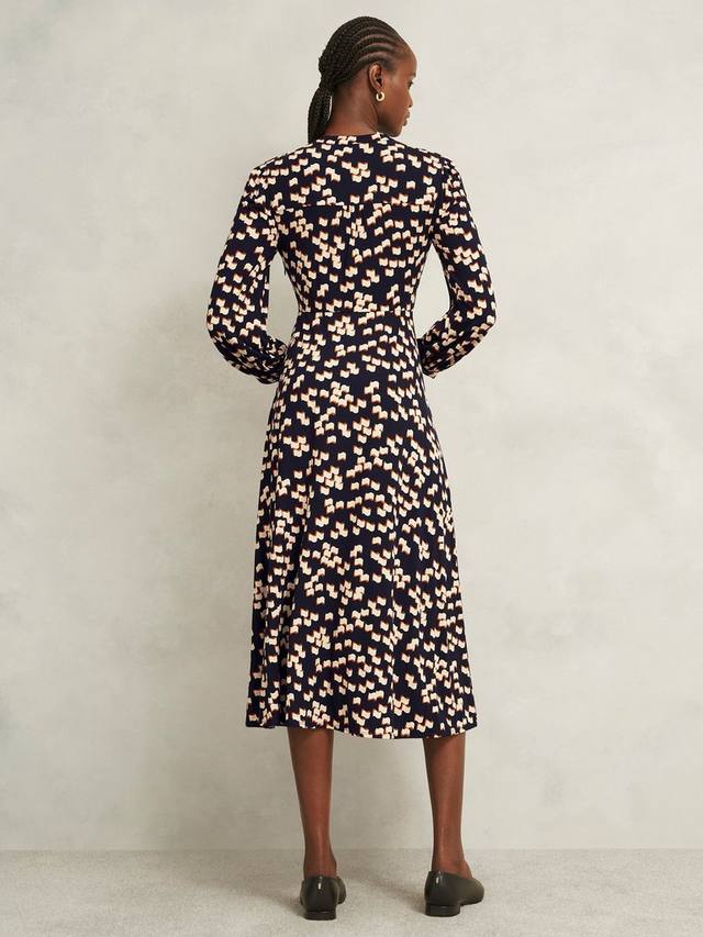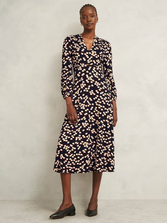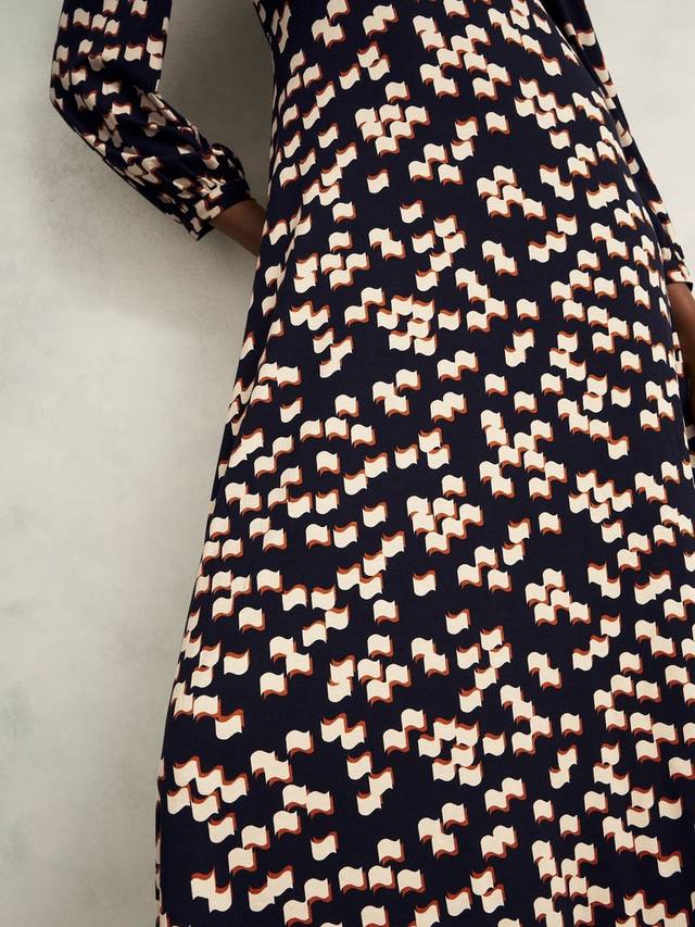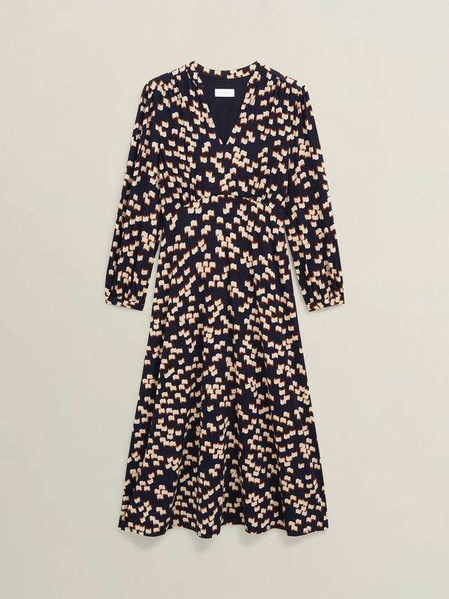Это миниатюрное платье миди А-силуэта с продуманным геометрическим узором, V-образным вырезом и рукавами три четверти. Удобный крой и мягкая ткань не стесняют движений, делая каждый день ярче и приятнее.