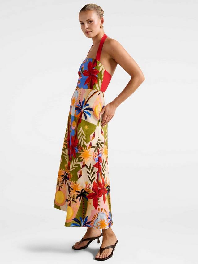 Украсьте свои летние и вечерние планы этим миди-платьем А-силуэта. Вырез горловины (халтер) и глубокий вырез на спине сохранят прохладу, а льняная ткань обеспечит комфорт и стиль. Яркий мозаичный принт добавит остроумный и современный штрих к вашему образу.