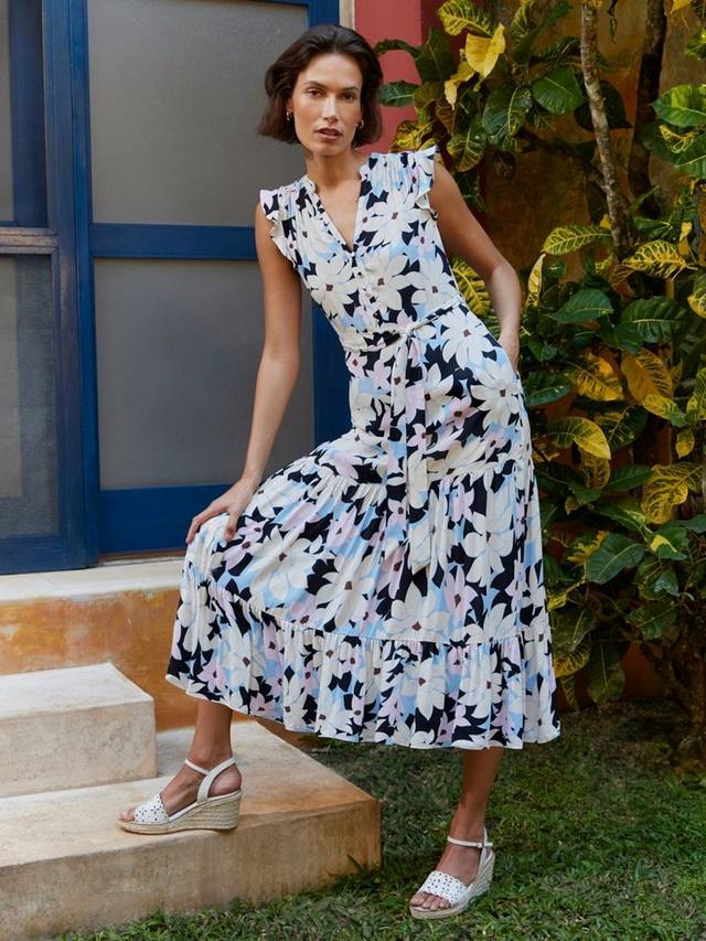 Платье Shauna от Hobbs наполняет женственностью каждый день. Платье без рукавов, облегающего силуэта с расклешенной юбкой, многоярусной юбкой, воротником-стойкой, завязкой на талии и боковыми карманами.
