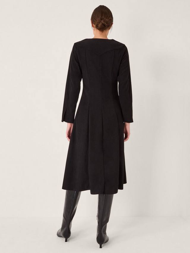 Это платье выполнено из эластичного вельвета с эффектным подолом миди. Застёгивается спереди на золотистые пуговицы.