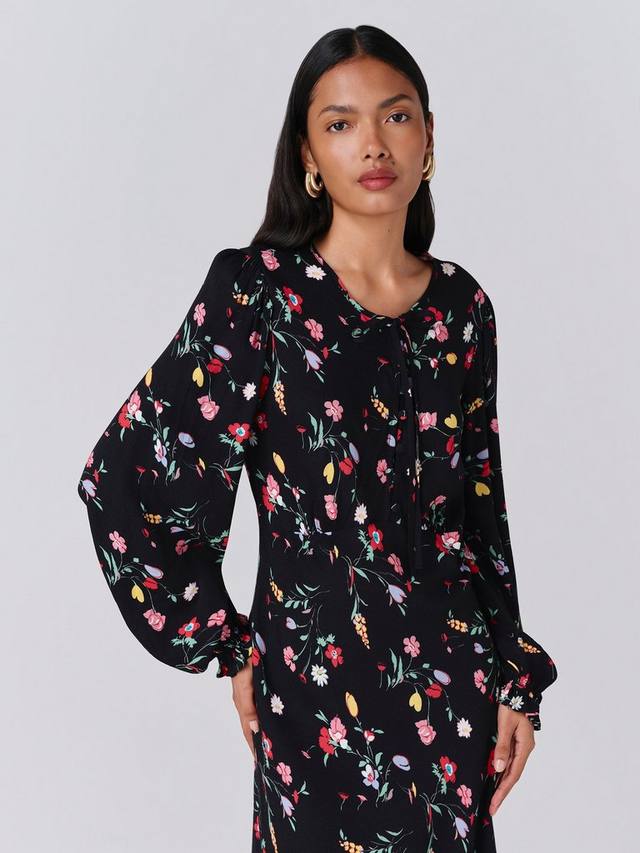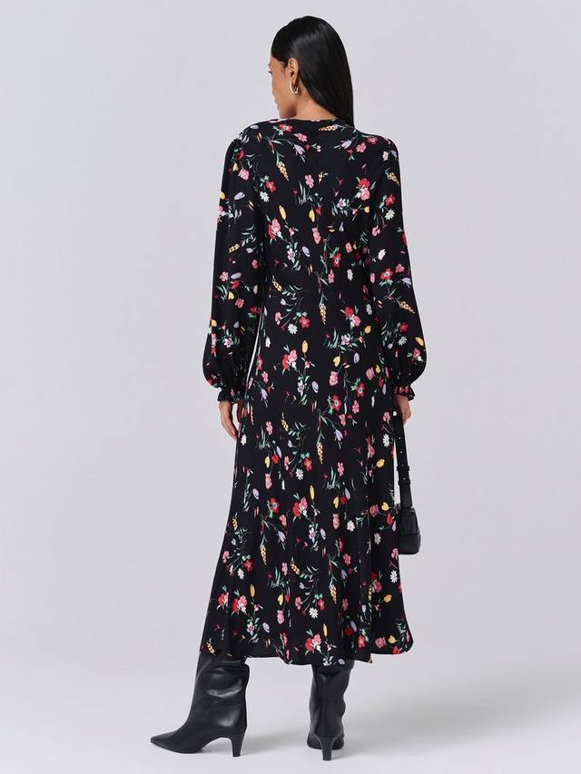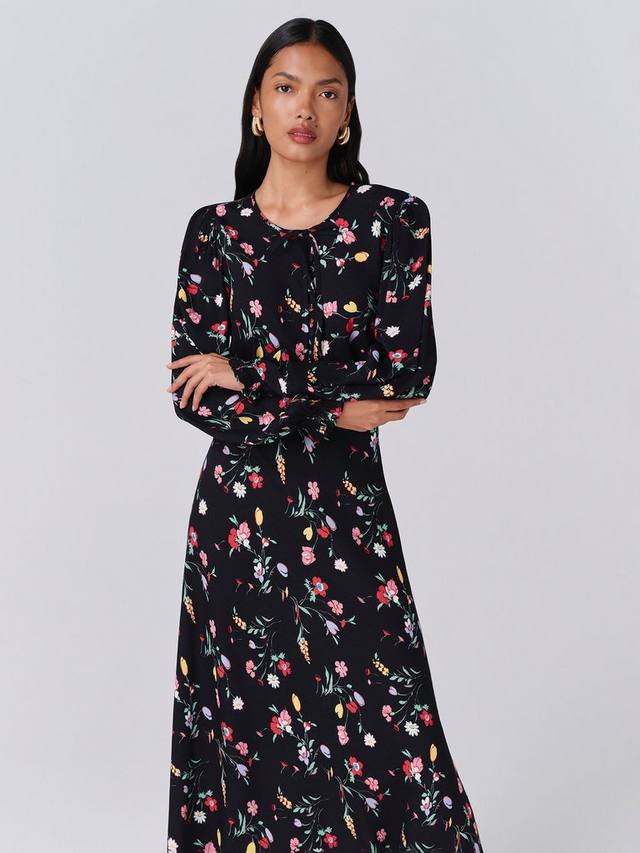Доказательство того, что А-силуэт — классика не зря. Это платье миди с длинными рукавами от Ghost отличается простым круглым вырезом и всегда актуальным цветочным узором.
