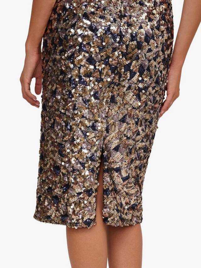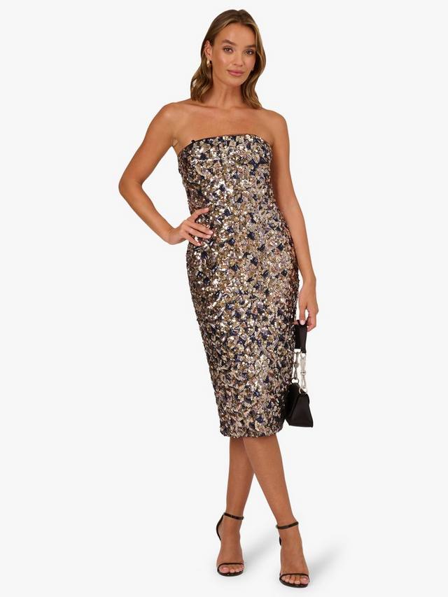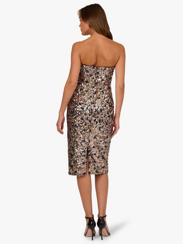 Это платье миди без бретелек очаровывает изысканными сверкающими деталями в элегантном облегающем силуэте длиной до колена. Полностью расшитое разноцветными пайетками, оно переливается многомерным светом, создавая поразительный эффект. Классическое и невероятно гламурное, это коктейльное платье станет идеальным вариантом для вашего следующего особого случая или большого выхода в свет.