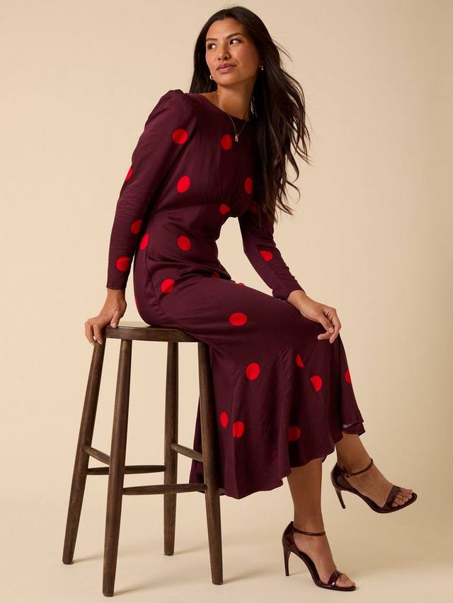 Идеальное платье в горошек. Это платье миди с узором в горошек имеет длинные рукава и сборку, образующую легкий А-образный силуэт.