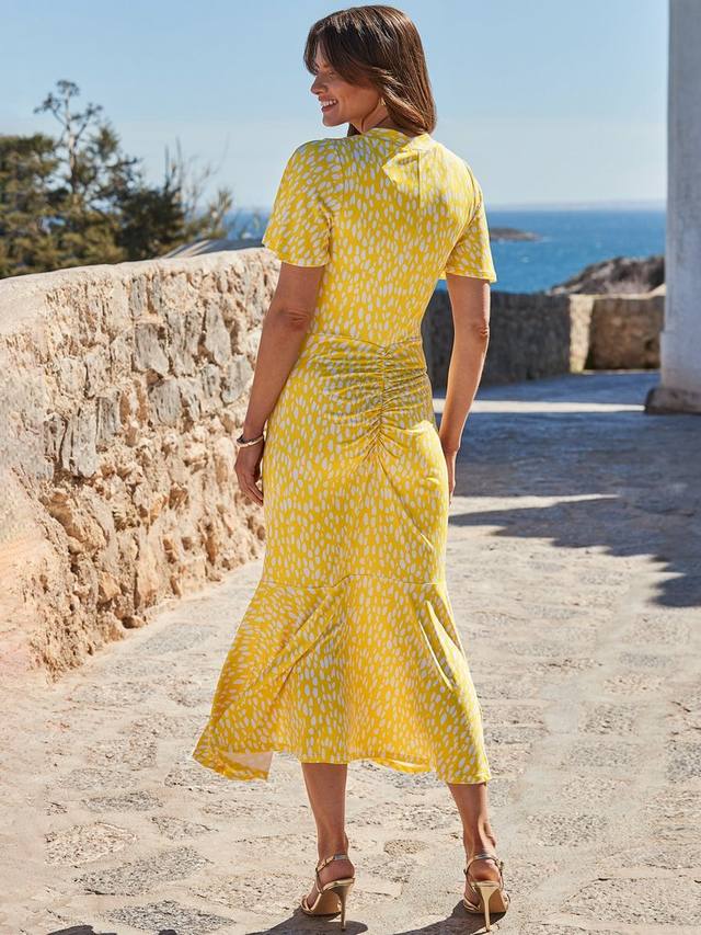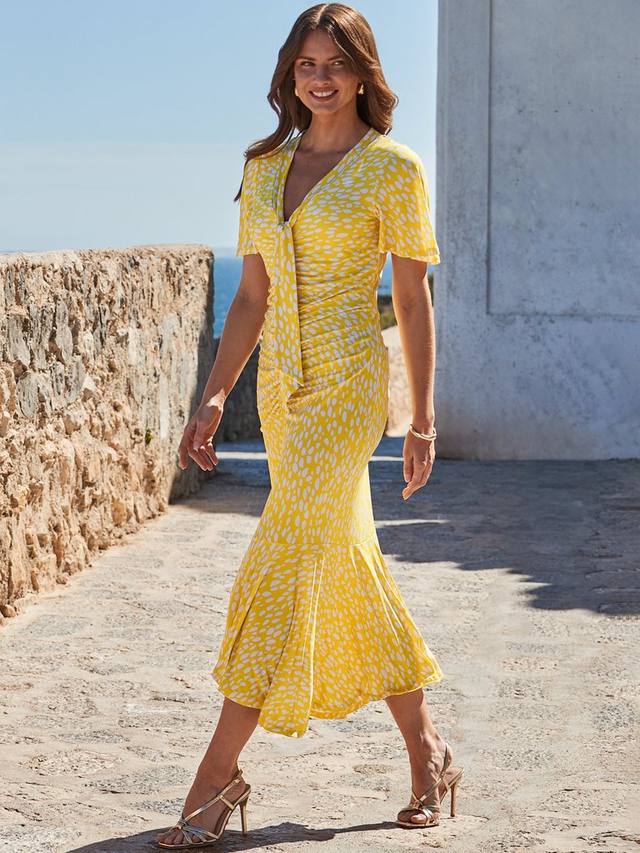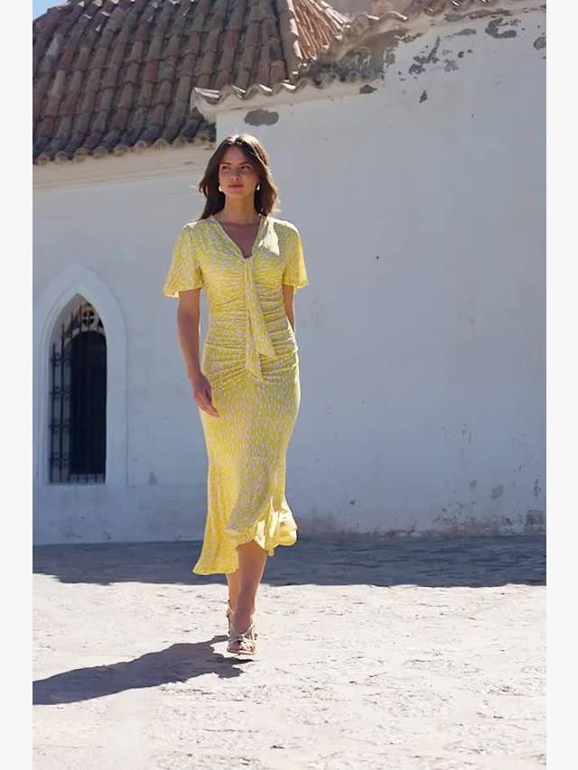 Добавьте лучик солнца в свой гардероб. Мягкая драпированная ткань элегантно облегает изгибы тела, а сборка спереди создает привлекательный силуэт.