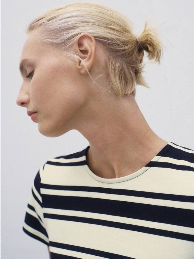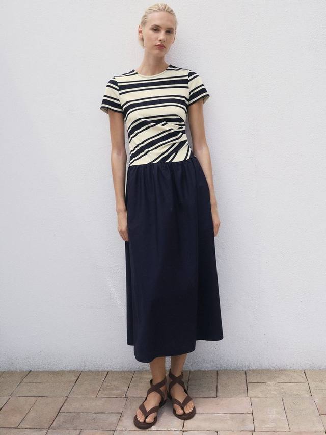 Назначение: лето. Это платье миди из чистого хлопка от Mango имеет простой полосатый лиф с круглым вырезом, короткими рукавами и однотонной расклешенной юбкой.