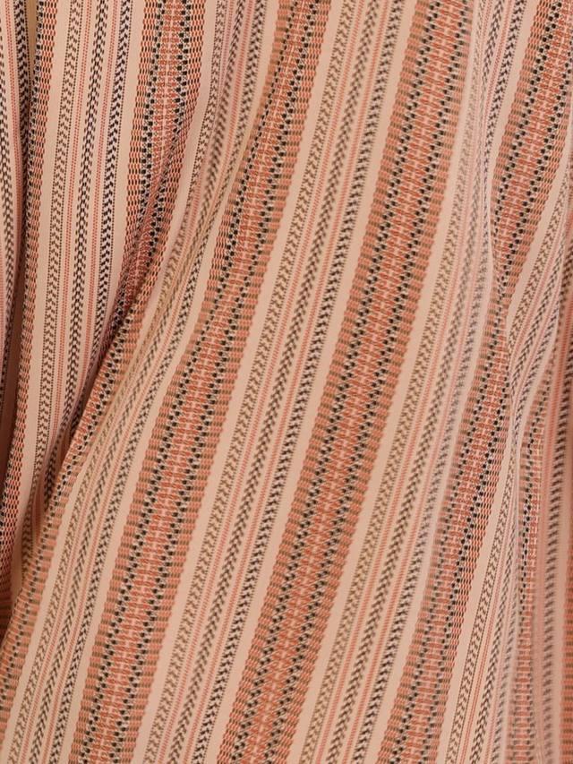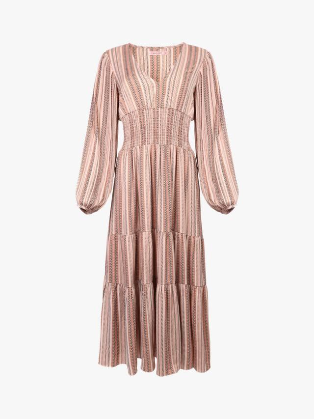 Великолепное платье миди с длинными рукавами-фонариками, глубоким V-образным вырезом и удобной присборенной талией, переходящей в струящуюся многоярусную юбку. Непринужденная элегантность в этой полосатой ткани.