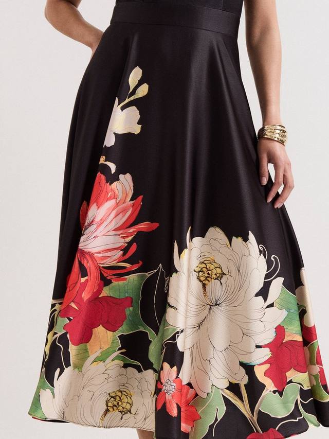 Это атласное платье миди для торжественных случаев воплощает сдержанную элегантность. Современный крой с халтер-хомут, струящийся атлас каскадом ниспадает к юбке, подчёркивая яркий цветочный узор. Присборено на талии, чтобы ещё больше подчеркнуть классический силуэт. Дополните образ чёрными туфлями на каблуке и подходящей сумкой, чтобы создать шикарный образ.