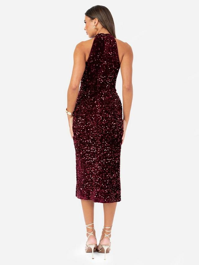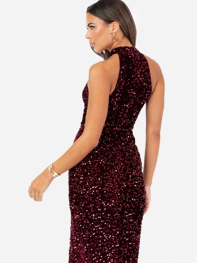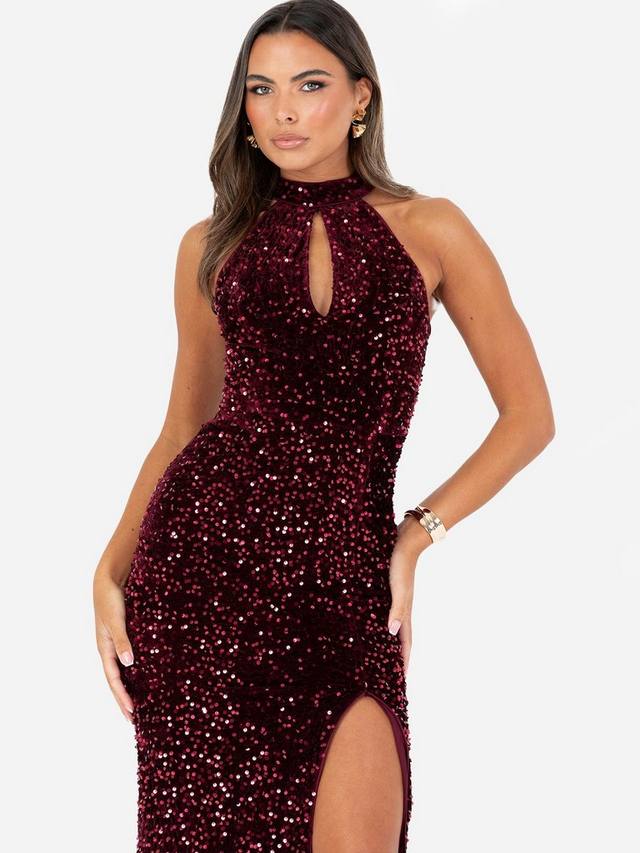 Это бархатное платье, смелое и элегантное, сверкает пайетками. Вырез халтер с замочной скважиной добавляет современный шарм, а облегающий силуэт и смелый боковой разрез обеспечивают легкость движений и эффектность.