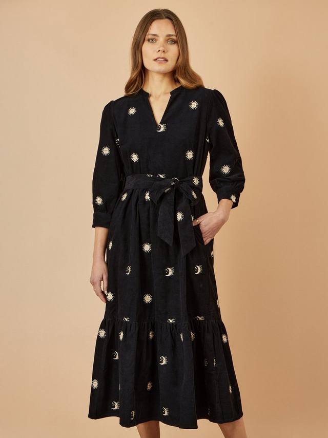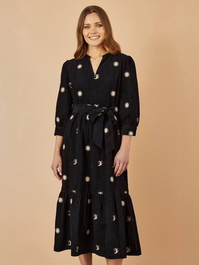 Это платье миди с космической вышивкой по всей длине идеально подходит для повседневной носки в любое время года. Космическая вышивка с изображением луны и звезд придает образу причудливый вид. Завязывающийся пояс придает этому платью-рубашке форму, а привлекательный вырез горловины и рукава 3/4 завершают образ.