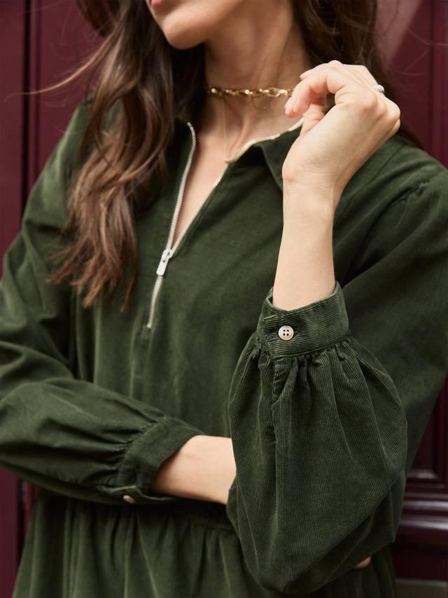 Нет ничего лучше платья из тонкого вельвета, которое можно надеть и пойти. Платье-миди Jean из хлопка отличается свободным кроем: воротник-стойка, молния на горловине и просторная многоярусная юбка. Сборка на манжетах и плечах делает его одновременно женственным и элегантным. Его можно носить с сапогами, свободными кардиганами и водолазками.