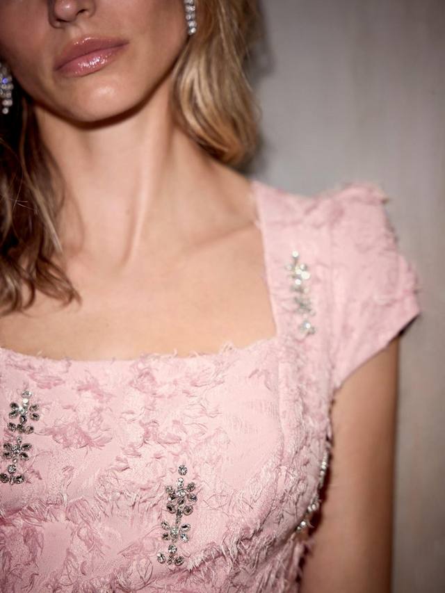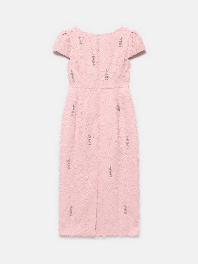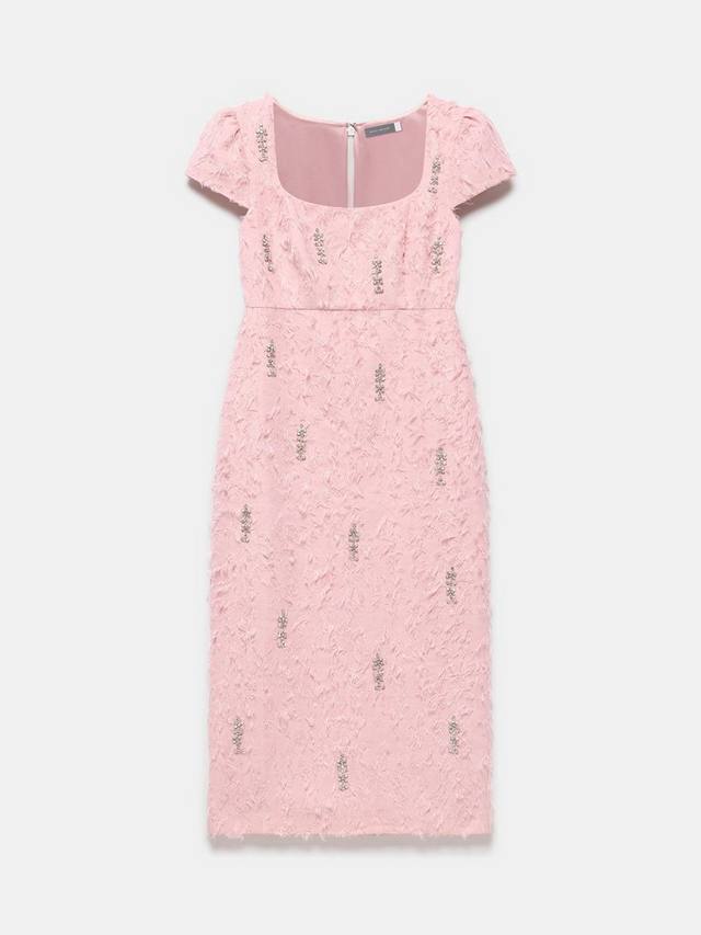Жаккардовое платье миди-силуэта с квадратным вырезом, рукавами-крылышками и декоративными деталями, застегивающимися на молнию на спине.