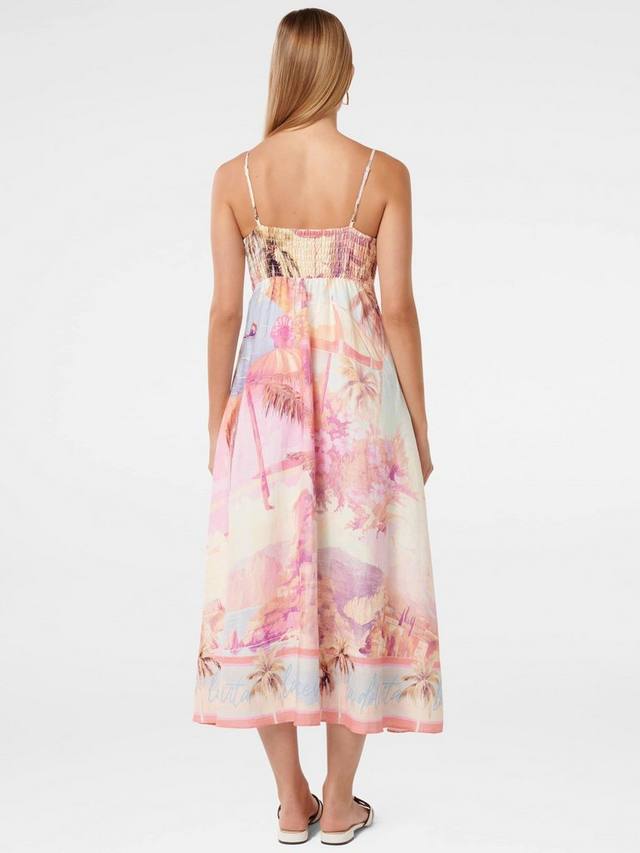 Это платье миди от Forever New универсального А-силуэта выполнено из дышащей льняной ткани на подкладке. Модель с бретельками дополнена объемным вырезом и ярким праздничным принтом.