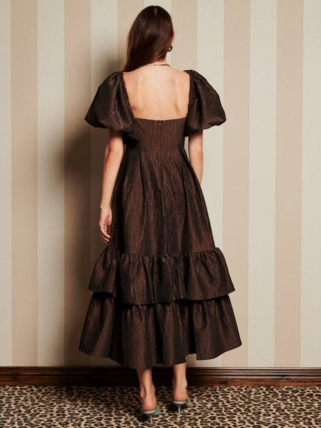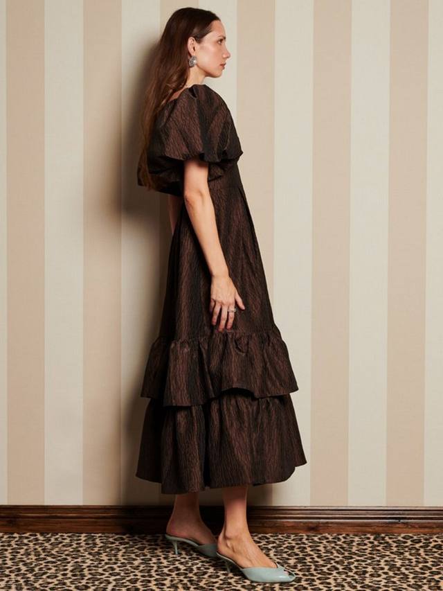 Платье миди из фактурной тафты. Полностью на подкладке, чашки с косточками. Дополнено пышной юбкой со складками на талии и двойной оборкой по подолу.