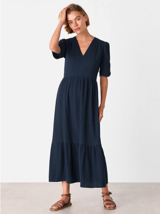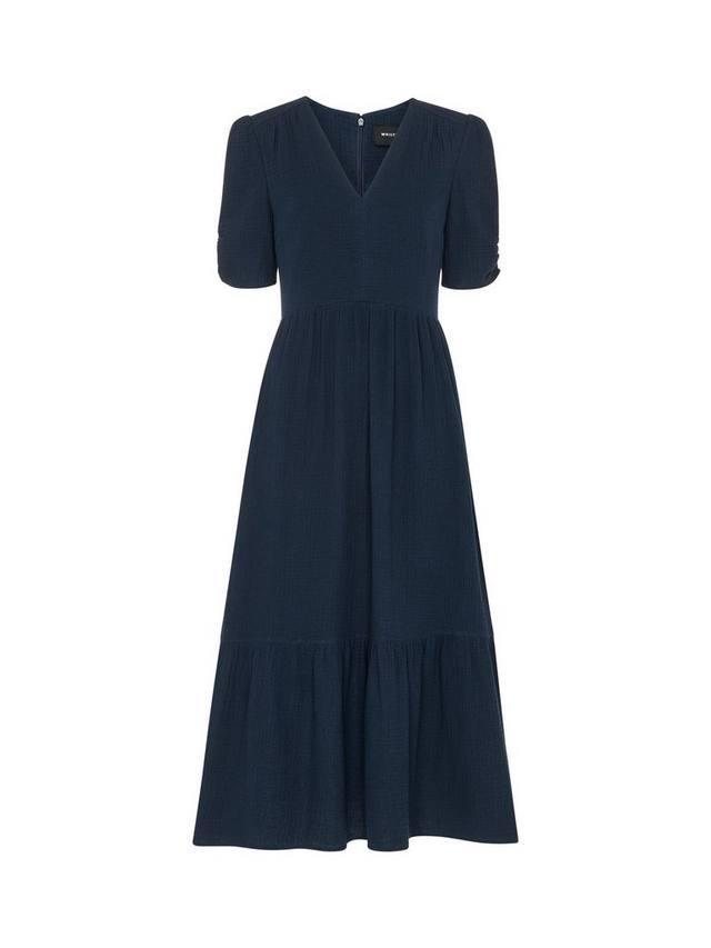 Это платье миди от Whistles, облегающее и расклешенное, выполнено из лёгкого, дышащего хлопка. Благодаря лаконичному, но элегантному V-образному вырезу и коротким рукавам, оно является воплощением чистого минимализма.