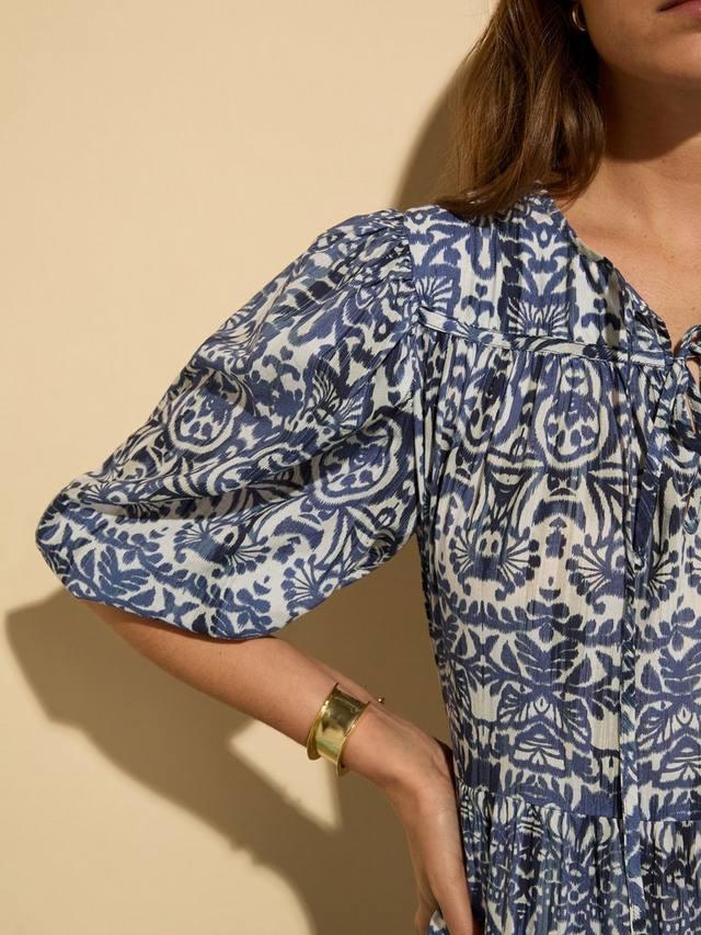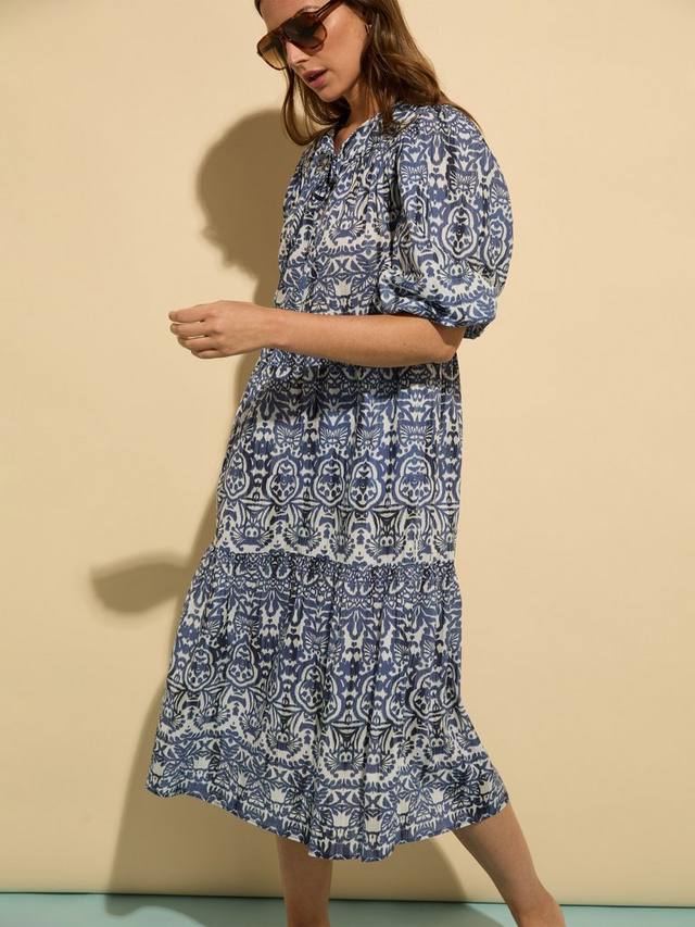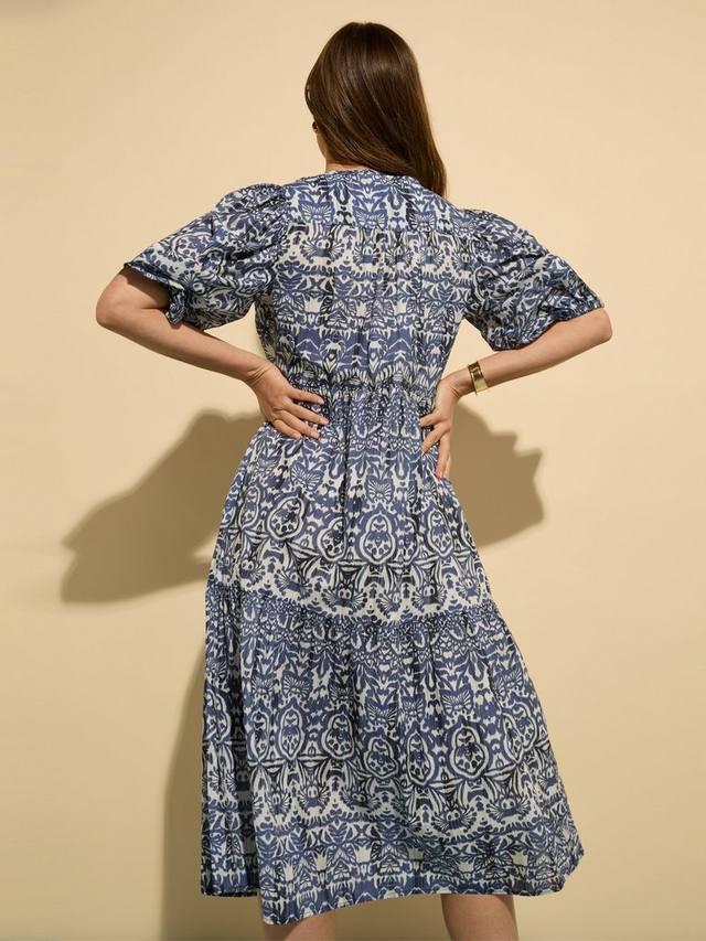 Легкий хлопок придает платью Mathilda от Baukjen воздушный силуэт, а привлекающий внимание принт и рукава-буфы добавляют элементы веселья в классический силуэт миди.