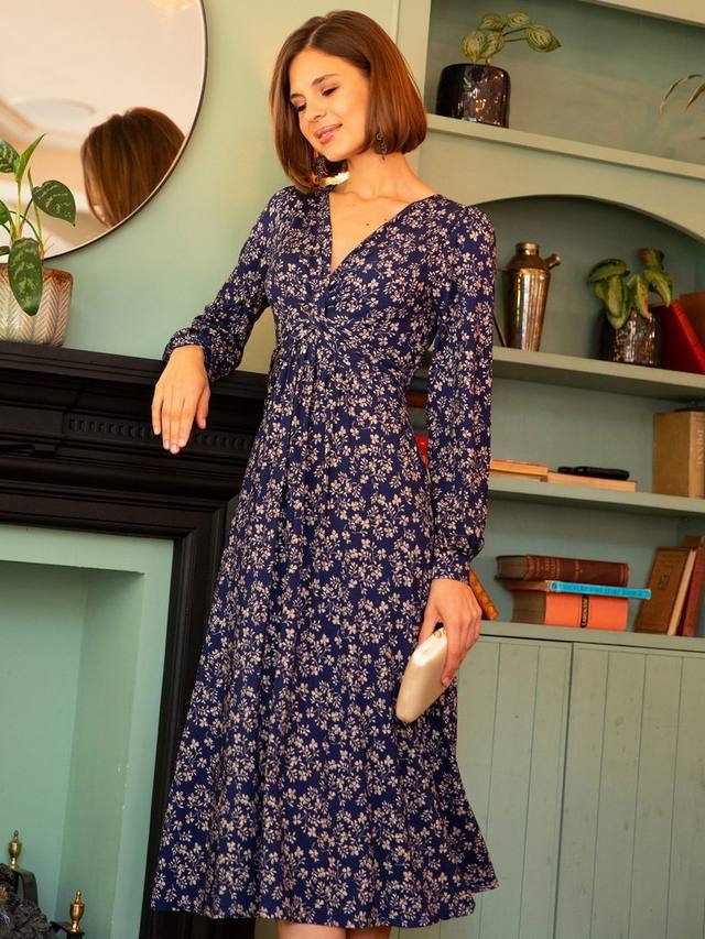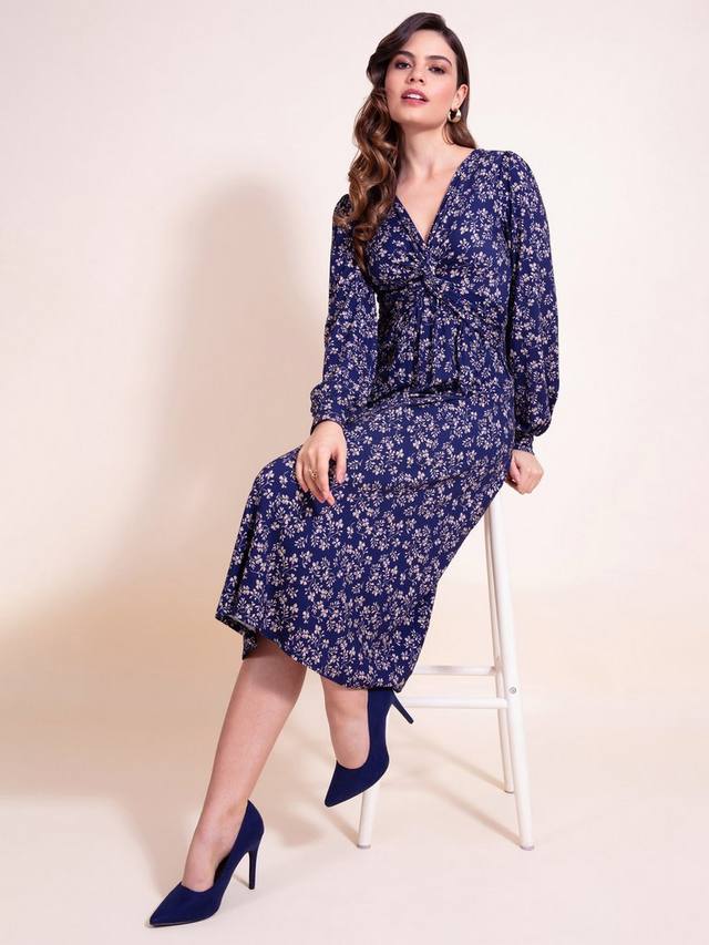 Глубокий вырез завязывается в скрученный узел, что делает это платье таким привлекательным. Длинные рукава с манжетами и струящаяся юбка миди. Наш элегантный принт Полуночное цветение делает это платье универсальным и подходящим для любого случая.