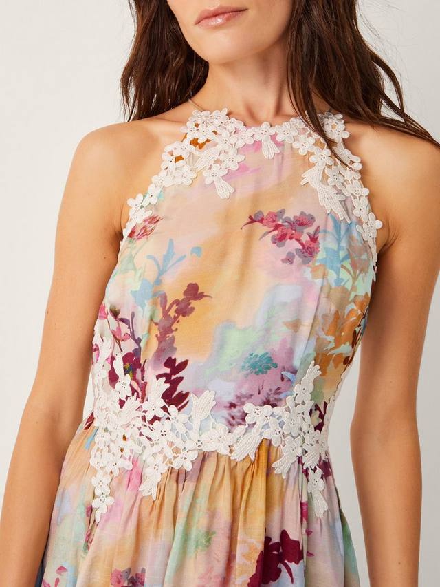 Выглядит так, будто вечеринка только что началась. Платье миди-силуэта украшено акварельным принтом, цветочной вышивкой до талии и неизменно привлекательным шейным вырезом. Свадьбы, садовые вечеринки, крестины... Как назовете, это платье готово к любому торжеству.