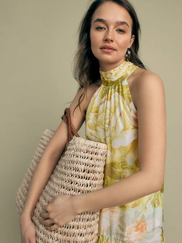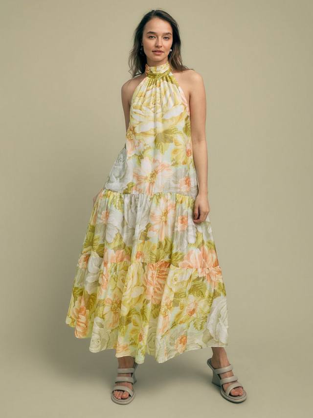 Многоярусное платье миди с американской проймой из мягкой вуали создаёт непринуждённый женственный образ. И, что самое главное, оно имеет карманы. Свободный крой, подкладка для комфорта, сплошной рисунок с пионами, завязка на спине и закруглённые швы.