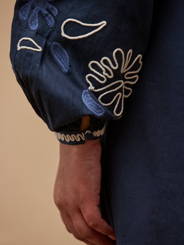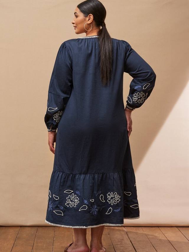 Платье миди А-силуэта, сочетающее в себе мягкий комфорт хлопка и детальную вышивку, создаёт эффектный и уверенный образ. Длинные рукава и V-образный вырез обеспечивают комфорт на каждый день, делая его идеальным для повседневных нарядов или особых случаев. Продуманное крое обеспечивает идеальную посадку и долговечность.