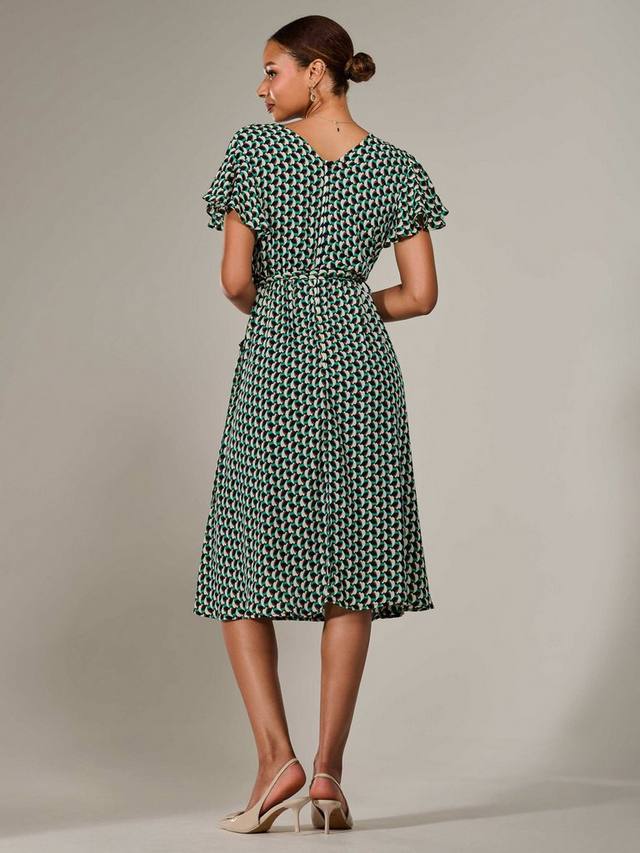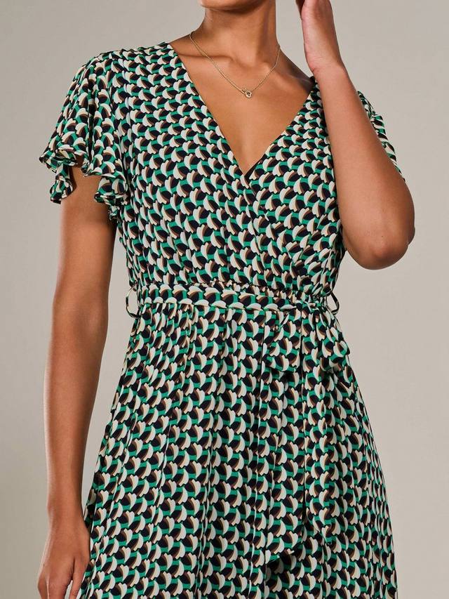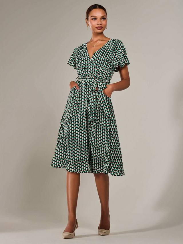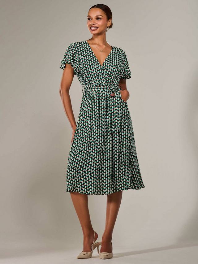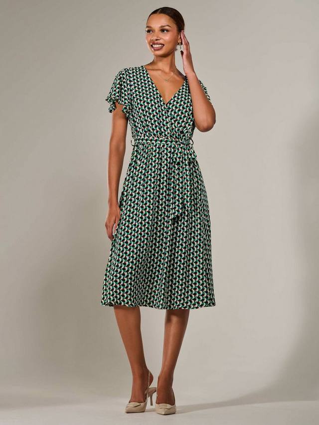 Влюбитесь в это миди-платье от Jolie Moi — идеальное решение для вашего рабочего и праздничного гардероба. Это шикарное миди-платье с короткими струящимися рукавами украшено геометрическим принтом, присборенным поясом для создания женственного силуэта, а также завязывающимся поясом и V-образным вырезом с запахом. Юбка с расклешенным лифом переходит в привлекательную длину миди.