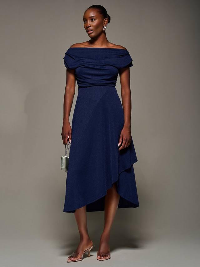 Платье с драпированным воротником-хомут от Jolie Moi отличается нежной складкой на плечах и легкой сборкой по боковым швам для изящного эффекта драпировки, а передняя юбка имеет двухъярусный дизайн, который спереди немного короче, чем сзади.