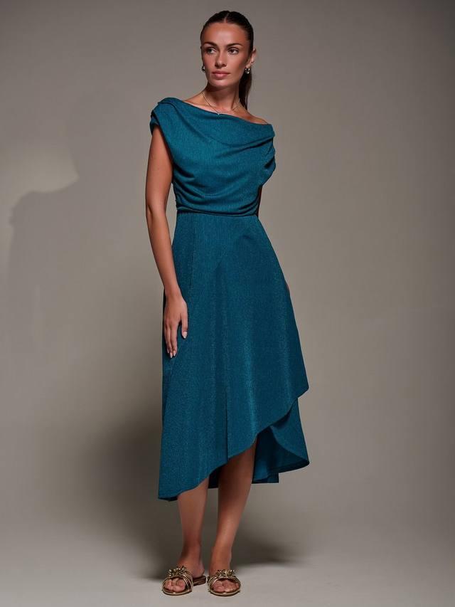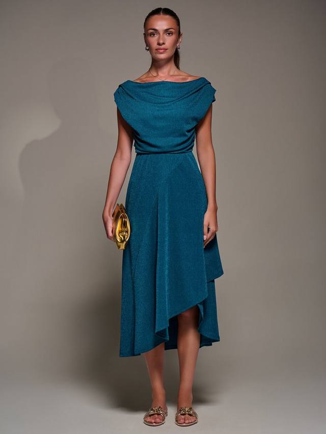 Платье с драпированным воротником-хомут от Jolie Moi отличается нежной складкой на плечах и легкой сборкой по боковым швам для изящного эффекта драпировки, а передняя юбка имеет двухъярусный дизайн, который спереди немного короче, чем сзади.