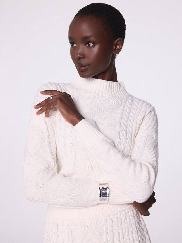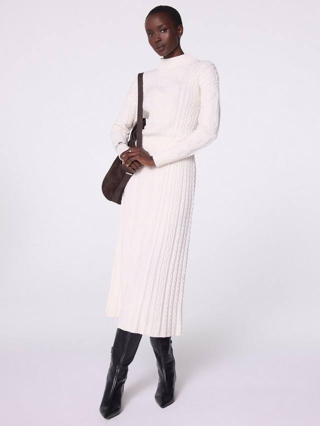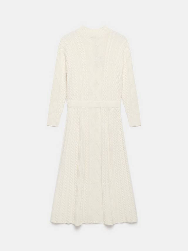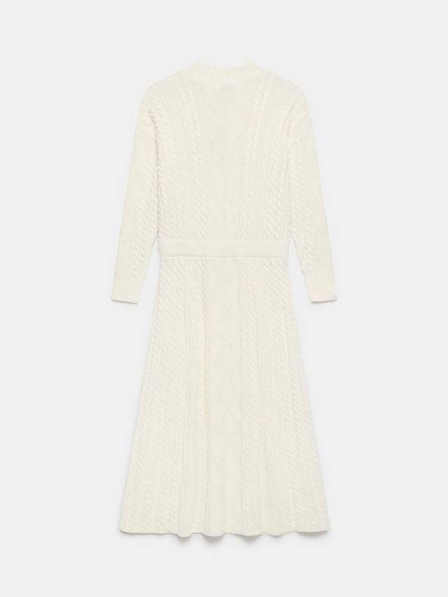 Платье из трикотажной пряжи с силуэтом миди, высоким вырезом, подчеркнутой талией и длинными рукавами.