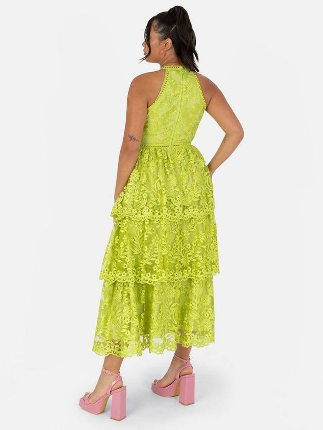 Его великолепный зелёный оттенок привлечёт внимание всех завсегдатаев вечеринок. Элегантный вырез-халтер и облегающий лиф гармонично дополняют изящный А-силуэт этого миди-платья. Многоярусная юбка ниспадает каскадом с пышными кружевными слоями и изящной фестончатой отделкой по краю оборки. Дополните этот комплект из цветочного кружева аксессуарами в пастельных тонах для летнего вечера или просто украсьте себя мерцающими золотыми украшениями и туфлями на каблуке с ремешками для создания вневременного образа.