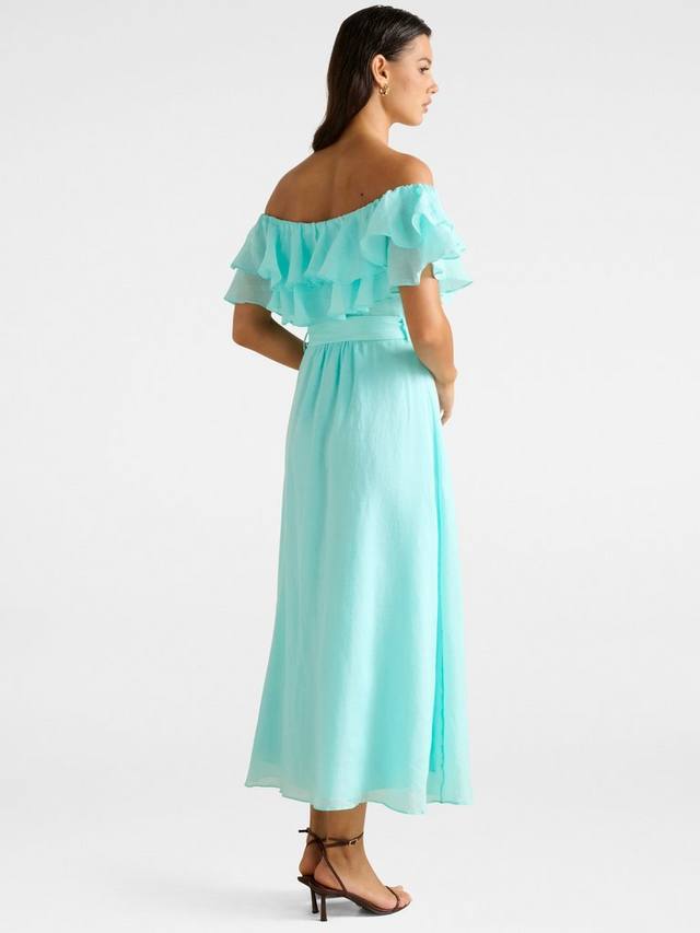 Это платье средней длины от Forever New, подчеркивающее талию, выполнено из лёгкой ткани. Вырез горловины бардо и короткие рукава подчеркивают минимальную детализацию, что делает его практичным в использовании.