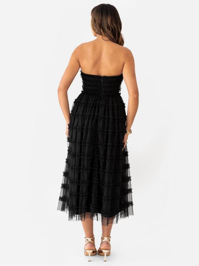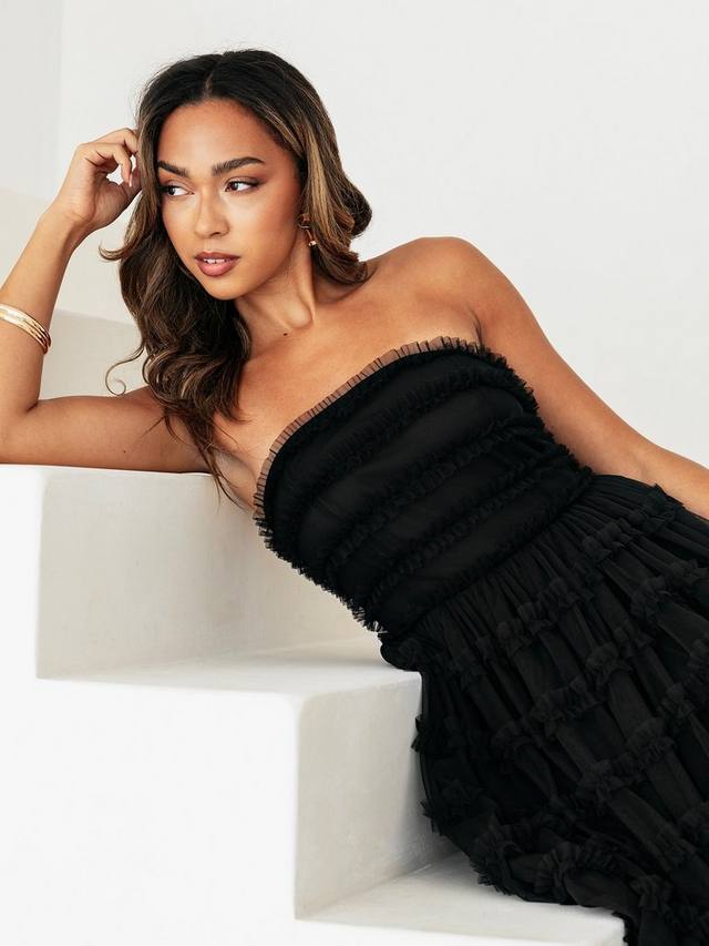 Выделитесь из толпы в этом очаровательном платье миди из тюля романтического оттенка. Лиф-бандо с открытыми плечами украшен изящными горизонтальными оборками, которые придают образу нотку изысканности. Объемный силуэт достигается благодаря многослойному тюлю на мягкой подкладке, а горизонтальные оборки в тон придают динамичность каждому шагу. Дополните это платье золотыми аксессуарами и туфлями на каблуке с ремешками, чтобы создать незабываемый гламурный образ.