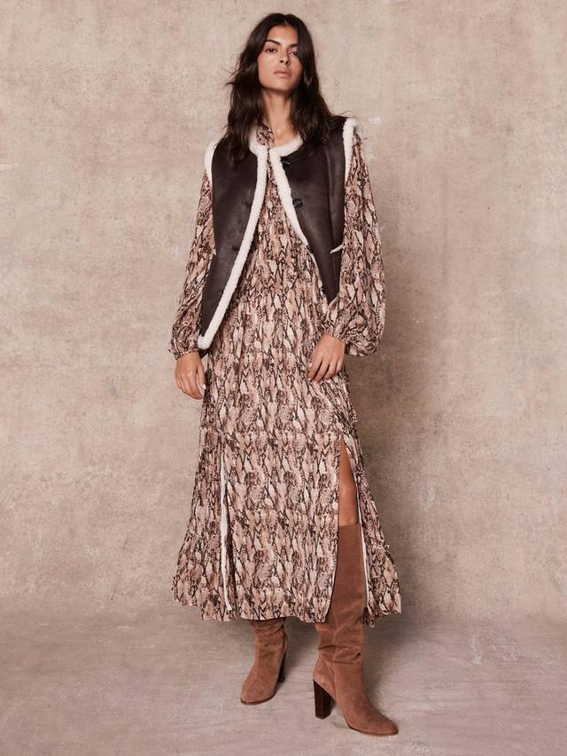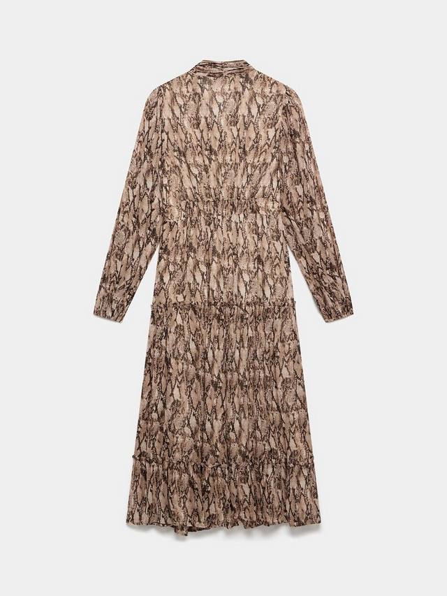 Платье со змеиным принтом, V-образным вырезом на завязке, длинными рукавами, эластичными манжетами, многоуровневым подолом и оборкой.