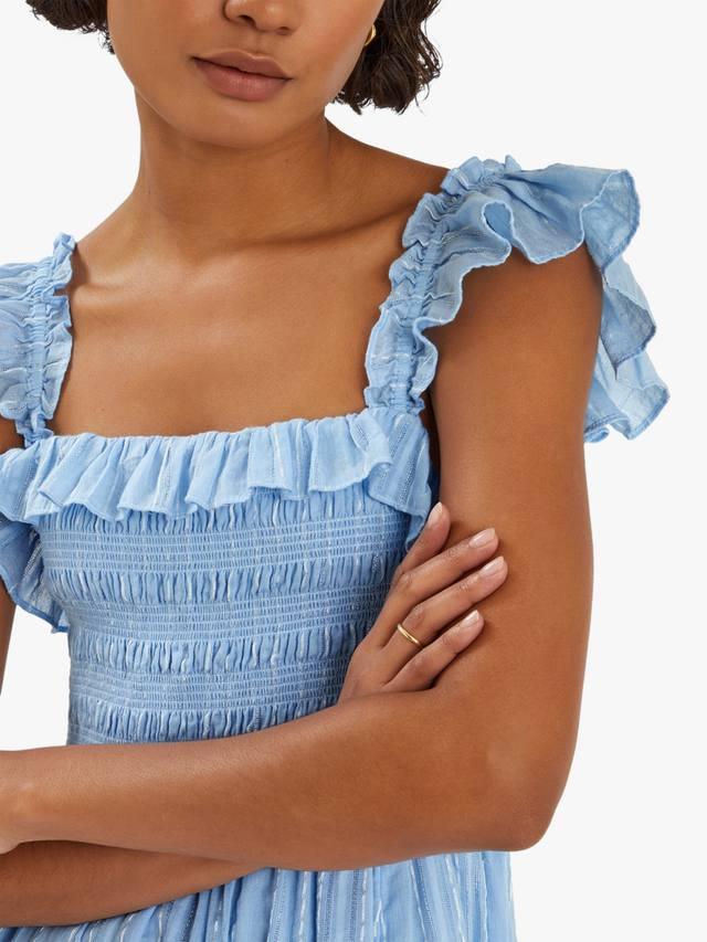 Это платье с присборенным лифом и боковым разрезом по подолу миди дополнено оборками и серебристыми полосками, которые придают ему немного блеска.
