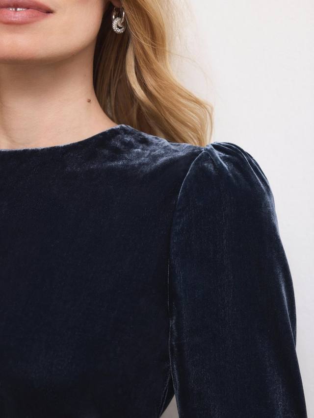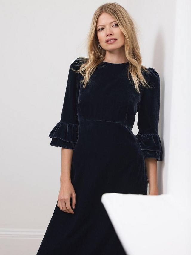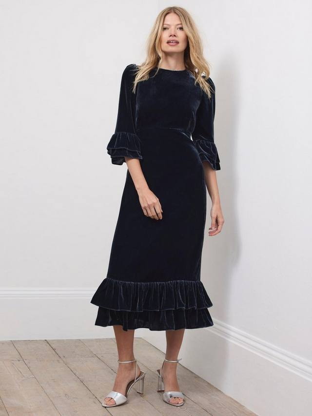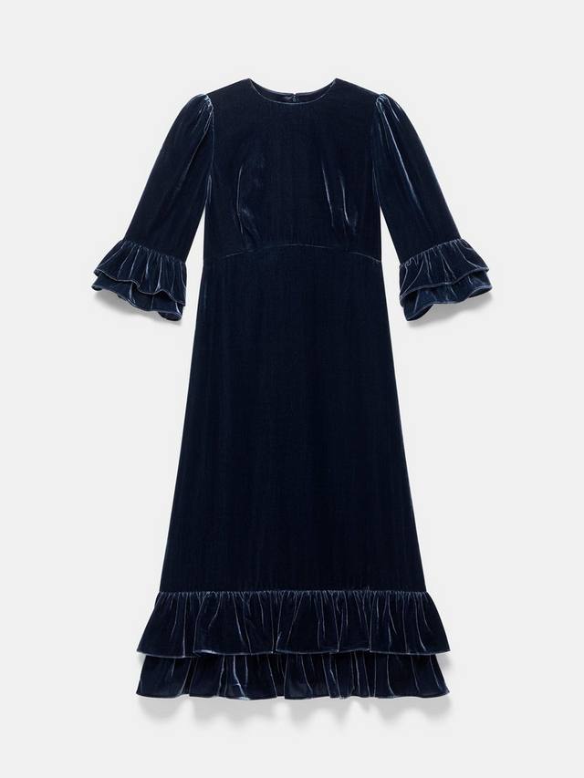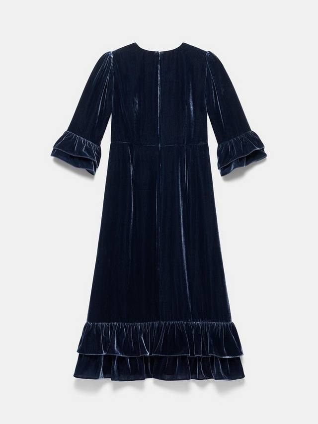 Темно-синее платье миди-силуэта с круглым вырезом, рукавами 3/4 с оборками и многослойным оборчатым подолом. Застежка на молнию на спине.