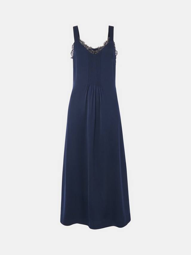 Это платье-комбинация от Whistles, украшенное кружевом на V-образном вырезе, имеет длину миди и минималистичный дизайн, создавая классический образ.