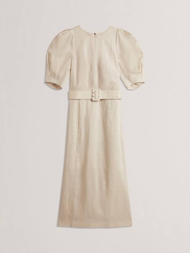 Это миди-платье с поясом от Ted Baker, выполненное в непринужденном А-силуэте, выполнено из мягкого, дышащего льна. Модель с круглым вырезом и рукавами-буфами не имеет рисунка или принта, поэтому вы можете дать волю своей фантазии и креативности в выборе аксессуаров.