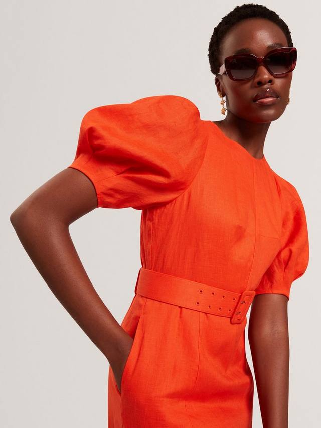 Это миди-платье с поясом от Ted Baker, выполненное в непринужденном А-силуэте, выполнено из мягкого, дышащего льна. Модель с круглым вырезом и рукавами-буфами не имеет рисунка или принта, поэтому вы можете дать волю своей фантазии и креативности в выборе аксессуаров.