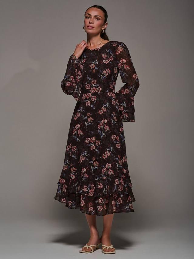 Платье миди с принтом оборка от Jolie Moi украшено женственным цветочным принтом на воздушном шифоне. Оно имеет многоуровневые манжеты с оборками, подолу с оборкой в тон и простой круглый вырез. Завязка на поясе добавляет формы, а незаметные карманы по бокам спереди и потайная молния сзади обеспечивают практичность. Платье полностью на подкладке и дополнено привлекательным V-образным вырезом на спине.
