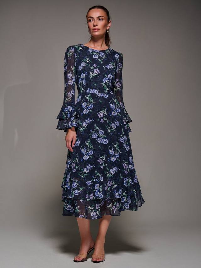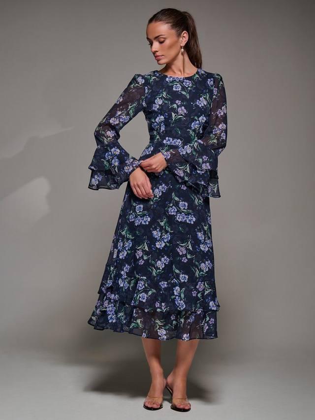 Платье миди с принтом оборка от Jolie Moi украшено женственным цветочным принтом на воздушном шифоне. Оно имеет многоуровневые манжеты с оборками, подолу с оборкой в тон и простой круглый вырез. Завязка на поясе добавляет формы, а незаметные карманы по бокам спереди и потайная молния сзади обеспечивают практичность. Платье полностью на подкладке и дополнено привлекательным V-образным вырезом на спине.