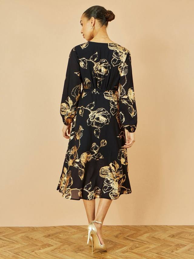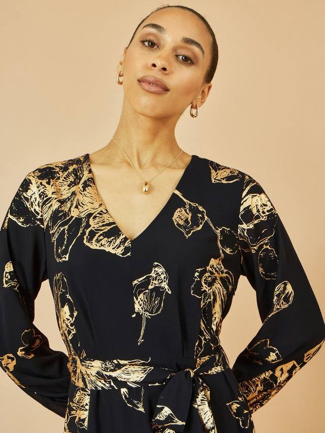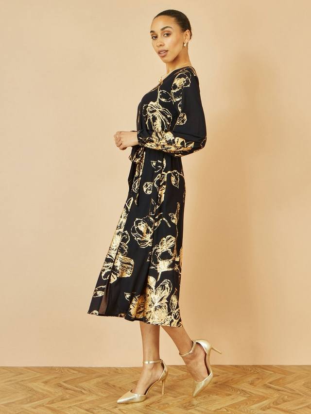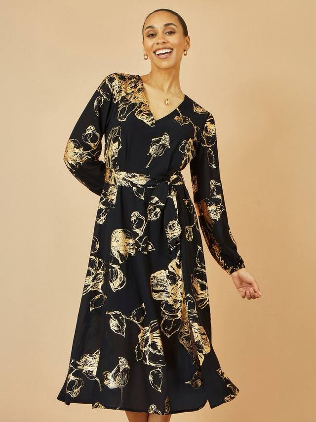 Это платье миди от Yumi – идеальный фасон для нового сезона. Длинные рукава обрамляют V-образный вырез и дополнены поясом на талии. Сочетание элегантного кроя и сплошного принта с фольгированными розами придает особый шарм. Можно носить с любыми приглашениями в праздничный сезон.